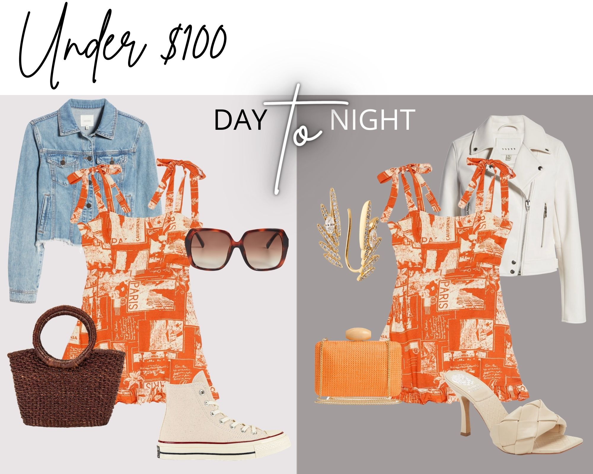 In this next edit, each piece is under $100. This orange printed mini is a sunny summer must! Try pairing it with a denim jacket and high-top sneakers for a cool & casual daytime vibe. Swap the sneaks for a little lift and a cool leather for a night out.