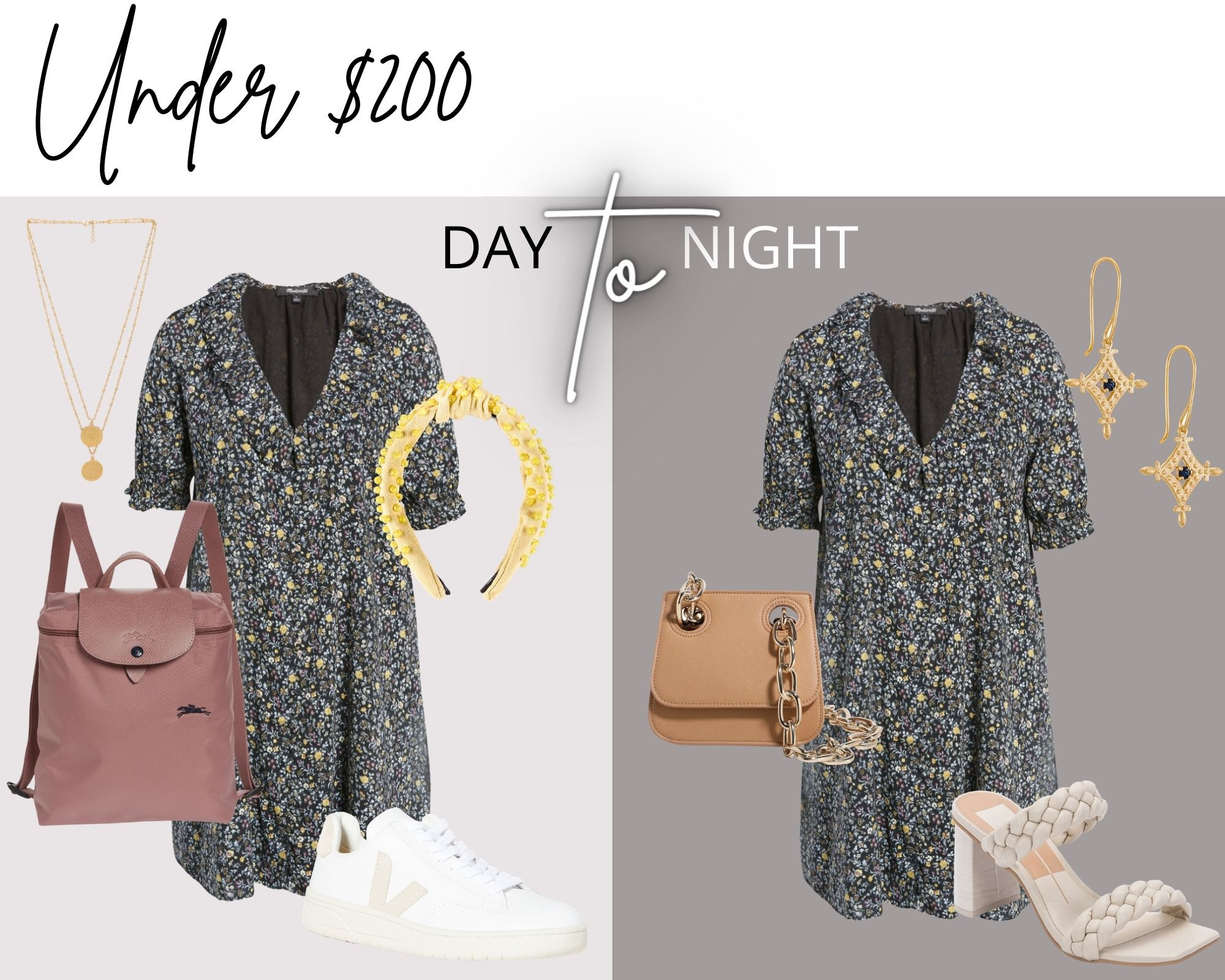 Next up, each piece in this edit is under $200. A flirty floral mini is probably one of the most versatile dresses out there. Wear it with easy neutral sneakers and a backpack for an effortless daytime ensemble (not to mention practical)! Then, dress it up with square-toed heeled sandals and statement earrings for the evening.