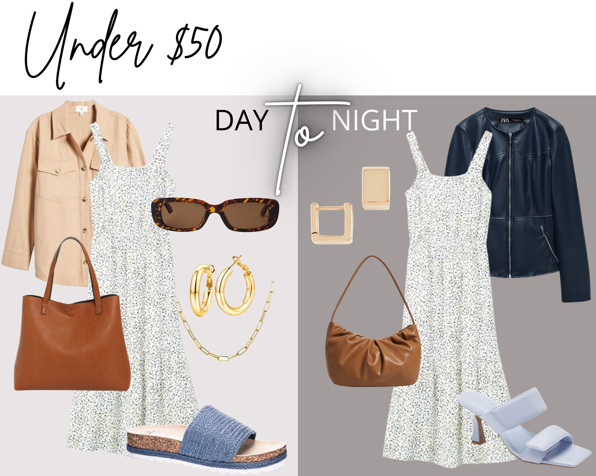 Finally, this edit might actually be my favorite! Every single piece is under $50!!! Some even well under. This dress is an Amazon Essential I bought on a whim, and it is so light and soft – ideal for the summer heat. Throw a lightweight shacket over it and slip on woven sandals for a day out an about. Don’t forget an oversized tote! For nighttime, switch the leather tote for a mini shoulder bag, a navy leather topper (if needed) and a baby blue heel.